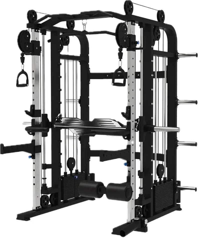 スミスマシン、ケーブルクロス、ハーフラックを一体化した多機能トレーニングマシン。
